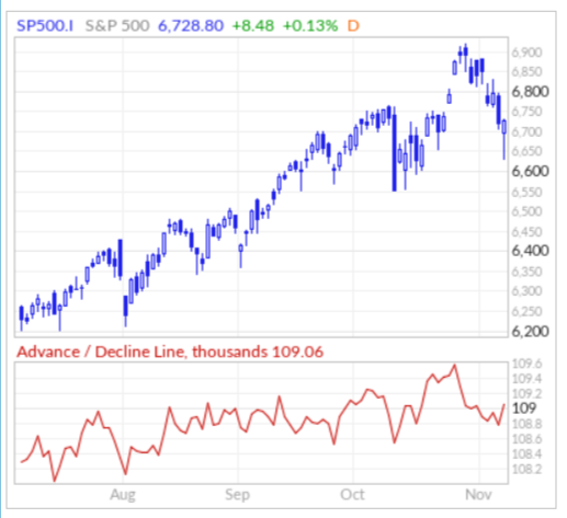 実際に記事作成をしている2025年11月時点でS&P500のADライン(騰落株線)を見ておこうと思います。ちなみにADラインはある一定期間内に上昇した銘柄数から下落した銘柄数を差し引いた値を表します。